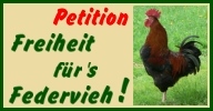 <a href="http://www.gegen-stallpflicht.de" target="_blank"> <img src="http://www.gegen-stallpflicht.de/dateien/FfFb1910.jpg" alt="Bitte unterstützen Sie die Petition Freiheit fürs Federvieh auf den Seiten von www.gegen-stallpflicht.de. Dort finden Sie auch viele wichtige Informationen zur Vogelgrippe und großformatige Bilder." title="Bitte unterstützen Sie die Petition Freiheit fürs Federvieh auf den Seiten von www.gegen-stallpflicht.de. Dort finden Sie auch viele wichtige Informationen zur Vogelgrippe und großformatige Bilder." width="192" height="100"></a>
