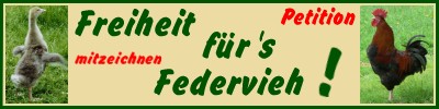 <a href="http://www.gegen-stallpflicht.de" target="_blank"> <img src="http://www.gegen-stallpflicht.de/dateien/FfFb4010.jpg" alt="Bitte unterstützen Sie die Petition Freiheit fürs Federvieh auf den Seiten von www.gegen-stallpflicht.de. Dort finden Sie auch viele wichtige Informationen zur Vogelgrippe und großformatige Bilder." title="Bitte unterstützen Sie die Petition Freiheit fürs Federvieh auf den Seiten von www.gegen-stallpflicht.de. Dort finden Sie auch viele wichtige Informationen zur Vogelgrippe und großformatige Bilder." width="400" height="100"></a>